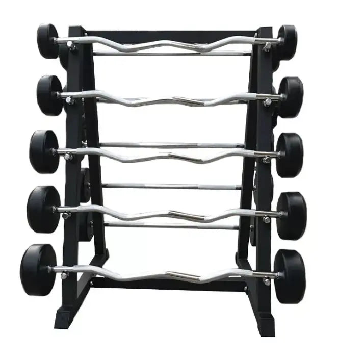 פתרון פרימיום מלא לחדרי כושר, סטודיו ואימונים ביתיים מתקדמים: סט שלם הכולל 10 מוטות קבועים איכותיים – חמישה מוטות ישרים וחמישה מוטות EZ – יחד עם מעמד אחסון דו־צדדי חזק ומעוצב לשמירה על סדר, נוחות ובטיחות באימון.