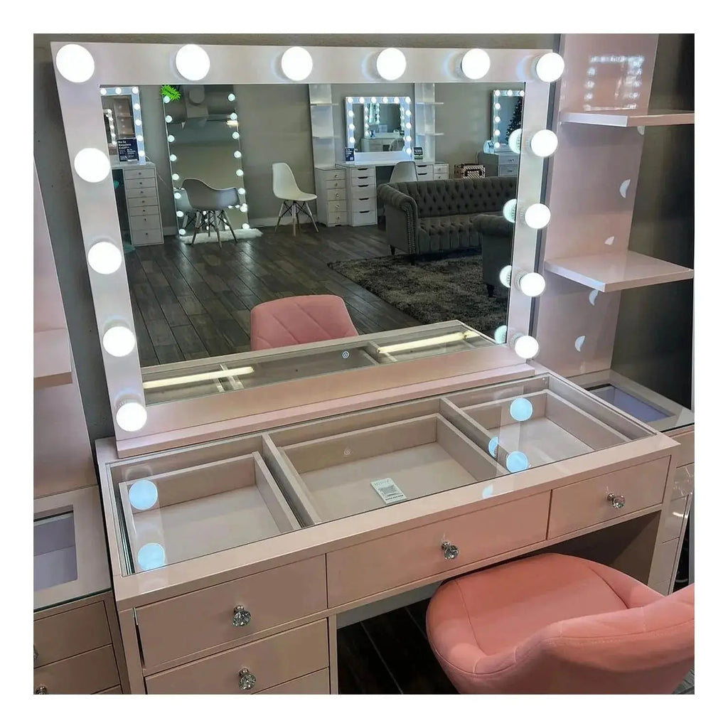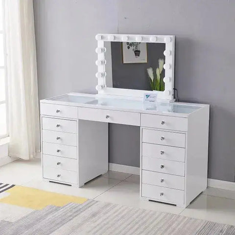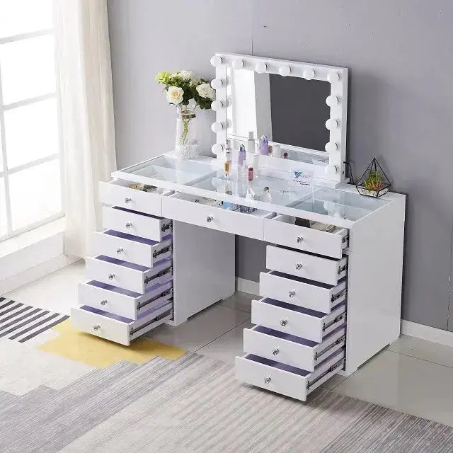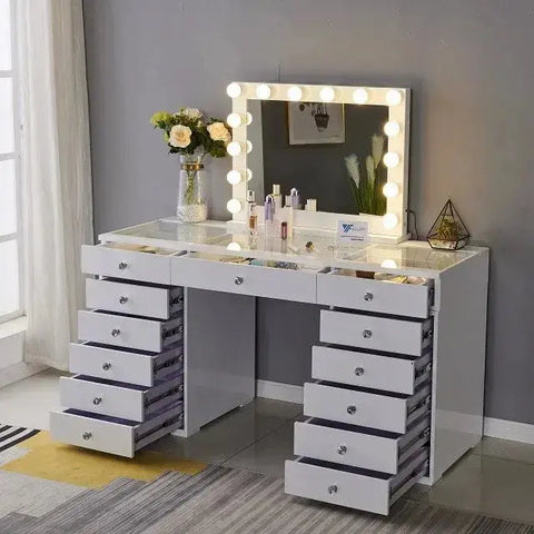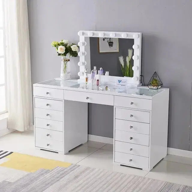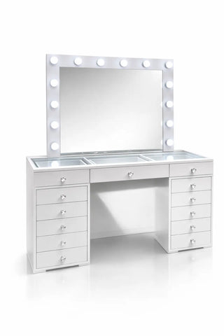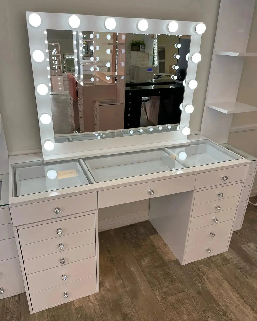 שידת איפור הוליוודית בעיצוב יוקרתי, עם מראה גדולה ותאורת LED מקצועית, 13 מגירות אחסון מרווחות וגימור לבן אלגנטי. מתאימה למאפרות מקצועיות, יוצרות תוכן וחובבות איפור שרוצות חוויית איפור מושלמת ומסודרת.